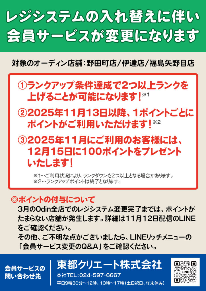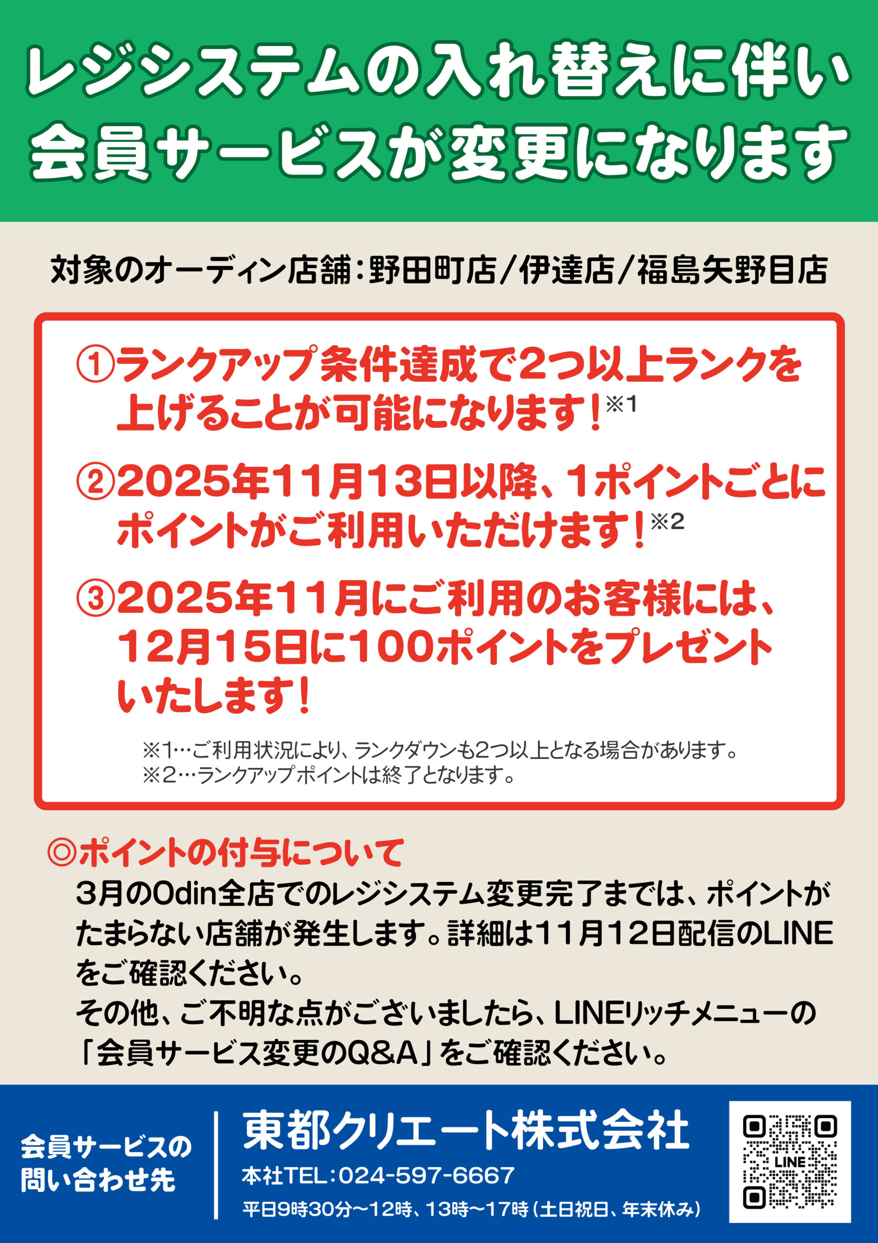 この度レジシステム入れ替えに伴い、会員サービスが変更となりますので