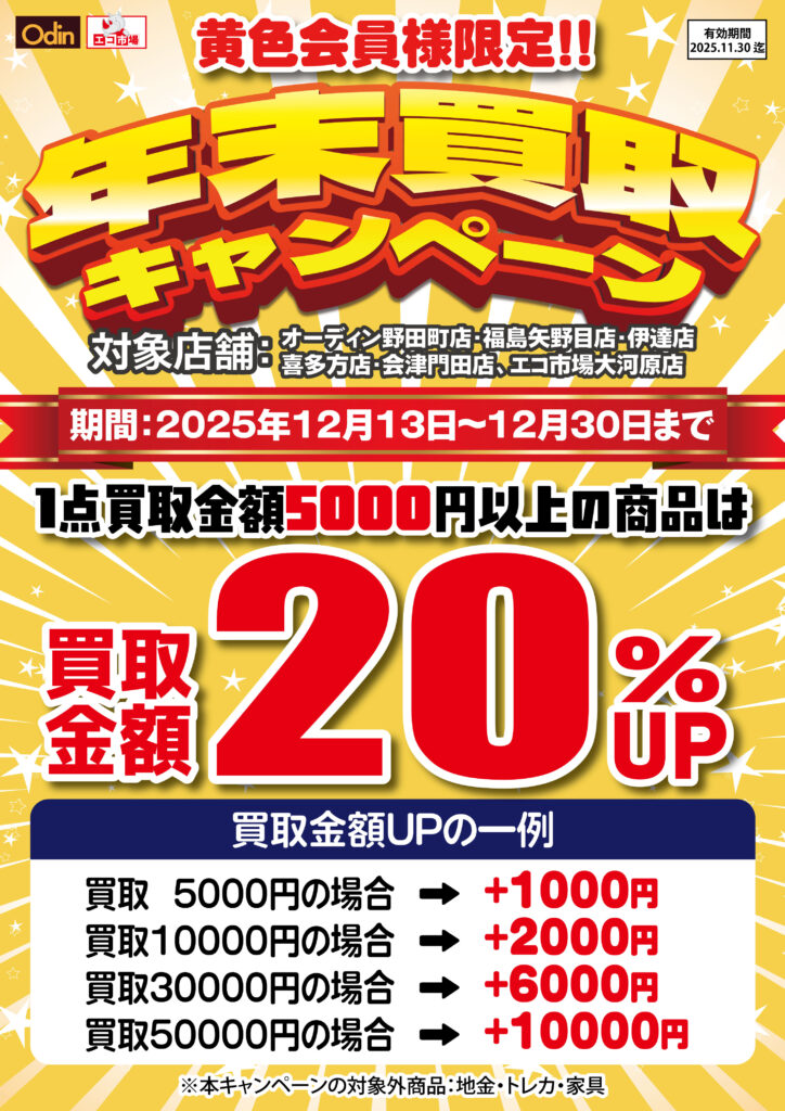 この度、対象店舗にて<黄色会員様限定!! 年末買取キャンペーン>を開催いたします。
