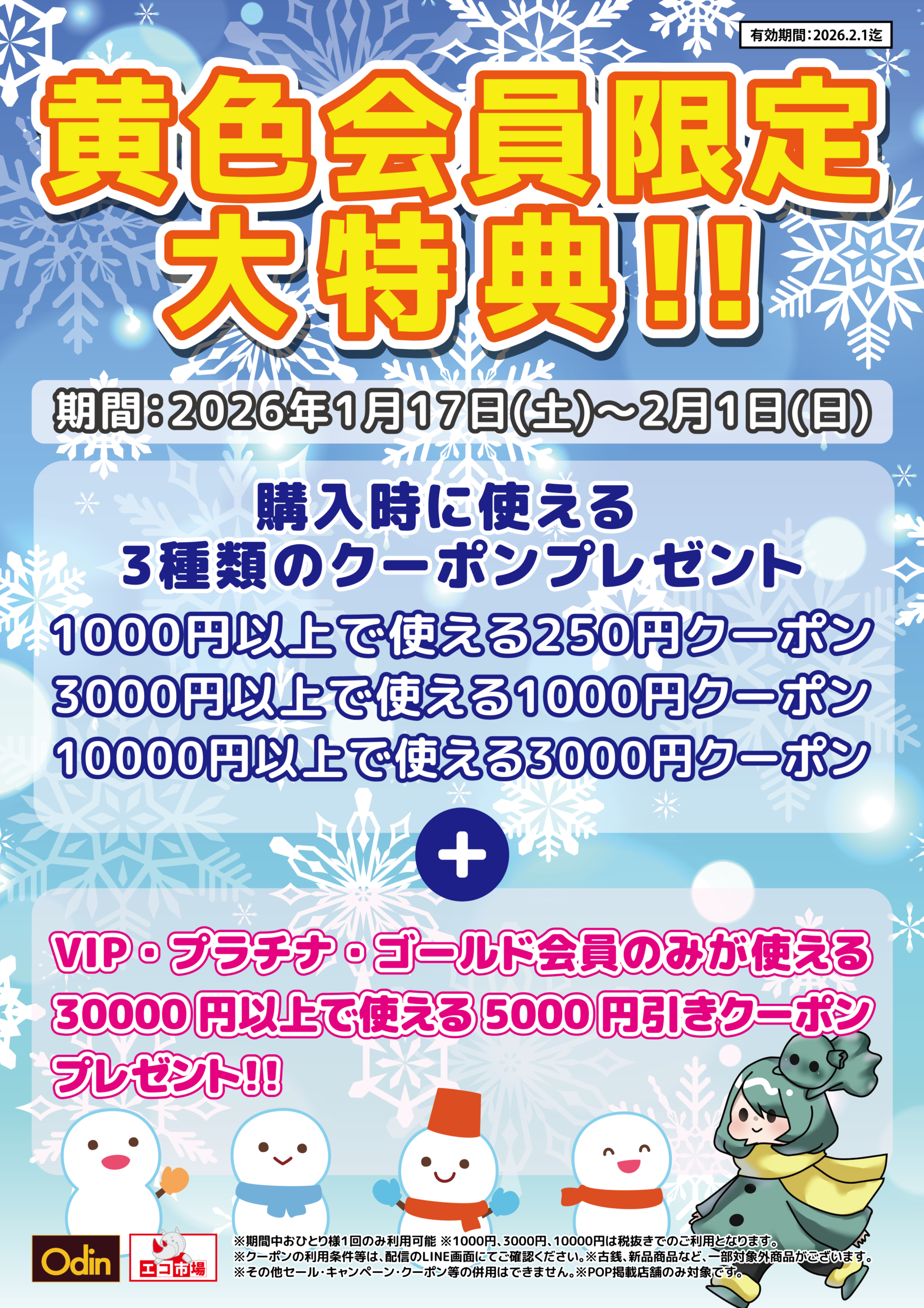 黄色会員限定で購入時に使える3種類のクーポンプレゼント