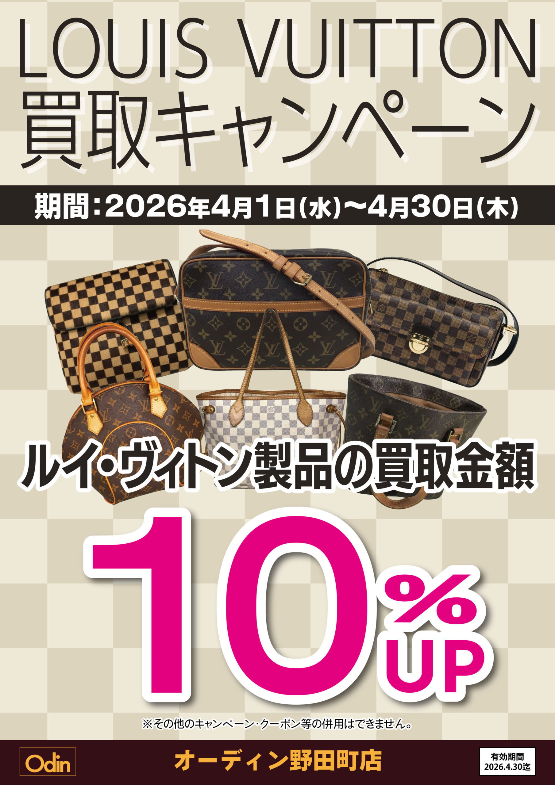 いつもオーディン野田町店をご利用いただきありがとうございます。 オーディン野田町店では期間中、◤ Louis Vuitton買取キャンペーン ◢ を開催いたします。 ■期間2026年4月1日~4月30日 ■キャンペーン内容ルイ・ヴィトン製品の買取金額が期間中 \1 0 %UP!!/ ※その他キャンペーン・クーポンの併用はできません。 お持ち込みこころよりお待ちしております。 X