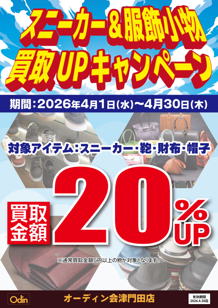 いつもオーディン会津門田店をご利用いただきありがとうございます。この度オーディン会津門田店では期間中、◤ スニーカー&服飾小物買取UPキャンペーン ◢ を開催いたします。 ■期間2026年4月1日~4月30日 ■キャンペーン内容期間中、対象アイテムの買取金額が20%UP!!対象アイテム:スニーカー・カバン・財布・帽子 ※通常買取金額5円以上の者が対象となります。 お持ち込みこころよりお待ちしております。 X