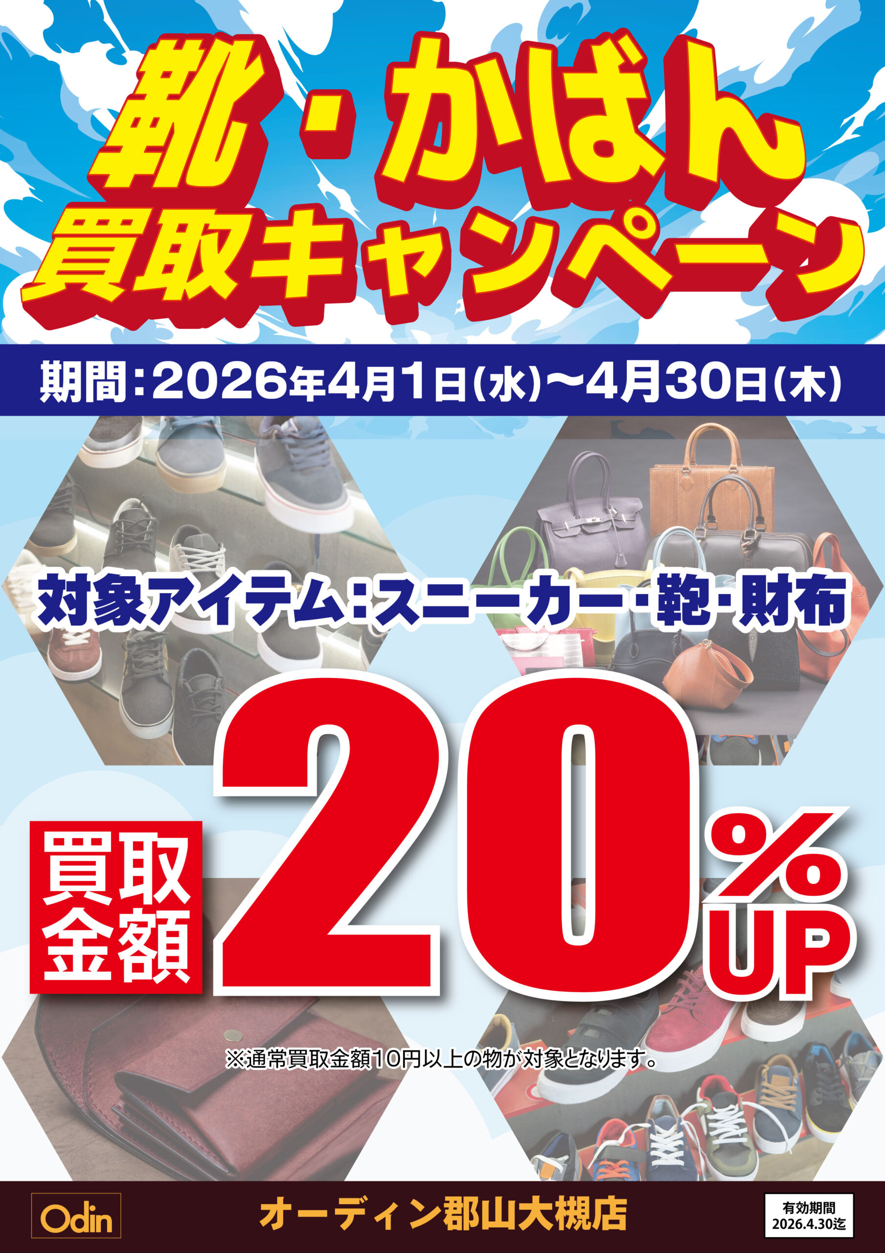 いつもオーディン郡山大槻店をご利用いただきありがとうございます。この度オーディン郡山大槻店では期間中、◤ 靴・かばん買取キャンペーン ◢ を開催いたします。 ■期間2026年4月1日~4月30日 ■キャンペーン内容スニーカー・かばん・財布の買取金額20%UP ※通常買取金額10円以上の者が対象となります。 お持ち込みこころよりお待ちしております。 X