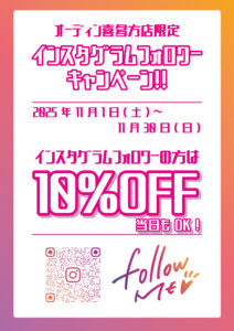 いつもオーディン喜多方店をご利用いただき誠にありがとうございます。 オーディン喜多方店で開催の<インスタグラムフォロワーキャンペーン>のお知らせです。 ■キャンペーン期間:2025年11月1日(土)~11月30日(日) […]