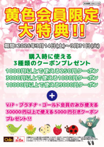 いつもオーディン/エコ市場をご利用いただきありがとうございます。 この度期間中、オーディン/エコ市場各店のPOP掲載店舗では、下記開催!! ◆◇◆◇◆◇◆◇◆◇◆◇◆◇◆ 黄色会員限定大特典!! 購入時に使える […]