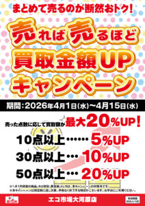 いつもエコ市場大河原店をご利用いただきありがとうございます。この度エコ市場大河原店では期間中、◤ 売れば売るほど買取金額が上がるキャンペーン ◢ を開催いたします。 ■期間2026年4月1日~4月15日 ■キャンペーン内 […]